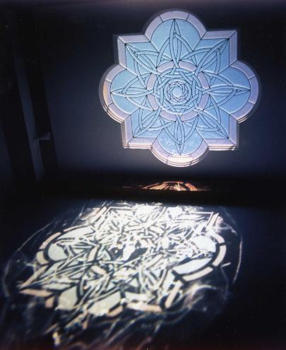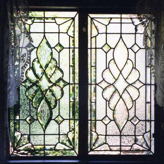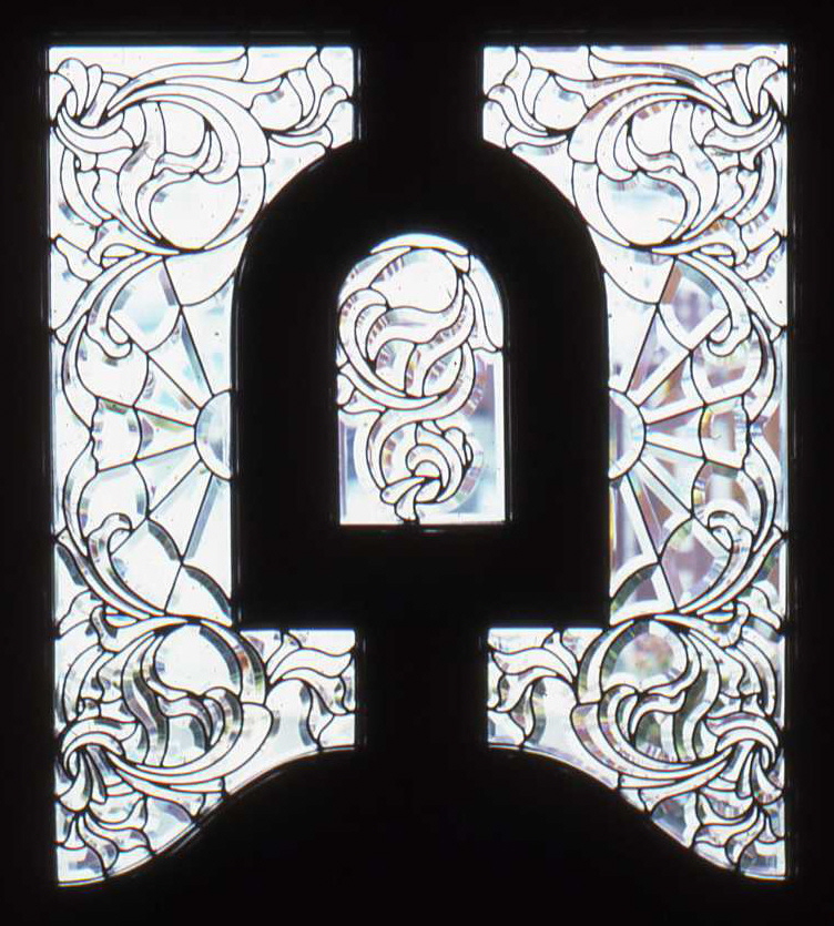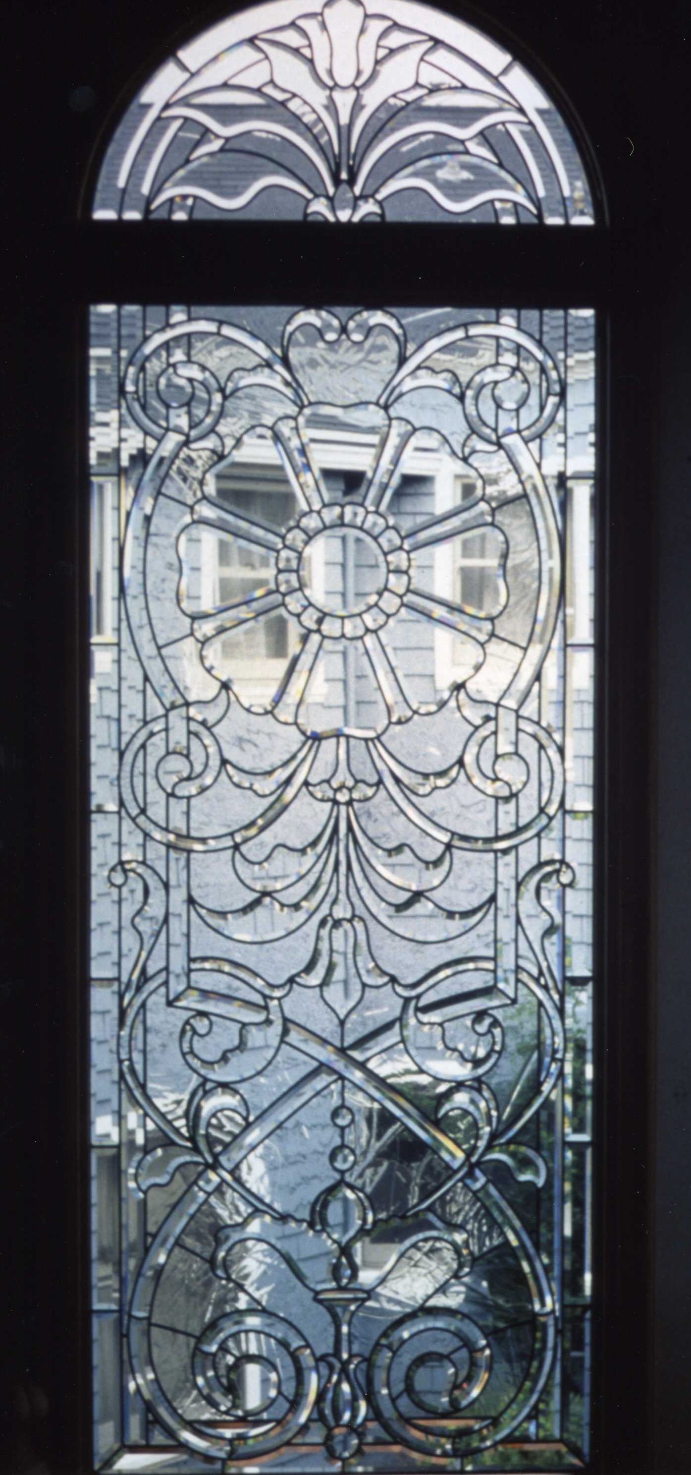 This is one of four 3 x 9 ft custom beveled panels with handmade textured glass background that were installed side by side. |